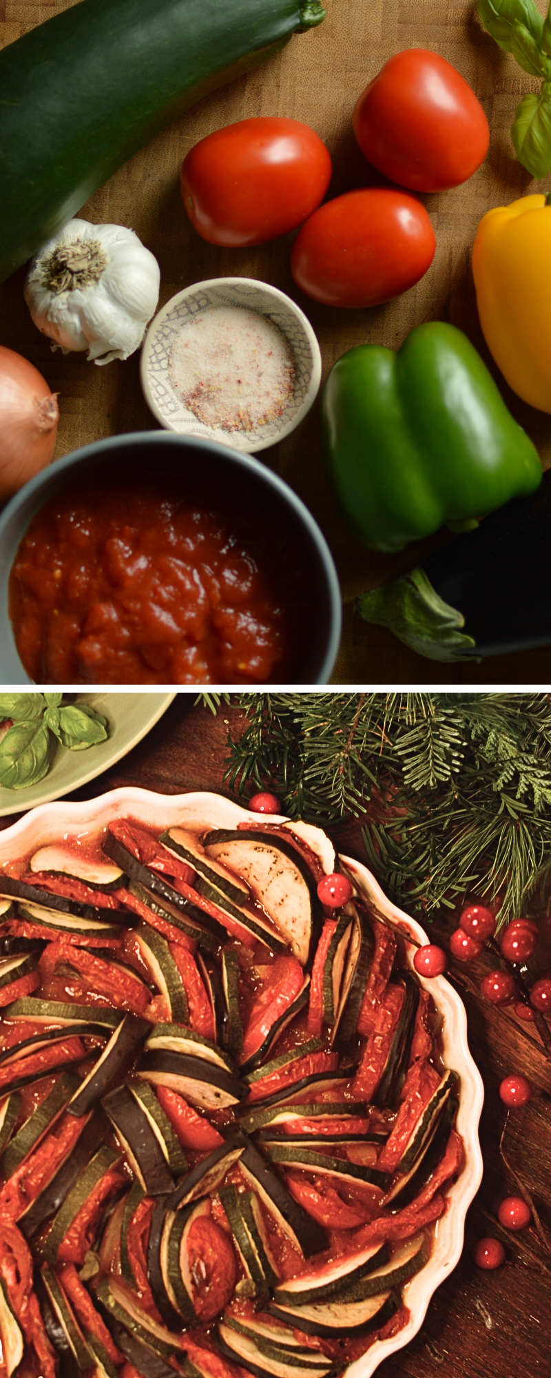 With its Christmas-colored layers of aubergine, zucchini, and tomatoes nestled into a fragrant, simmered tomato-and-pepper base, this classic dish brings a burst of color and freshness to the holiday table. It’s vibrant, hearty, and full of the kind of rustic comfort that makes guests feel instantly at home.
