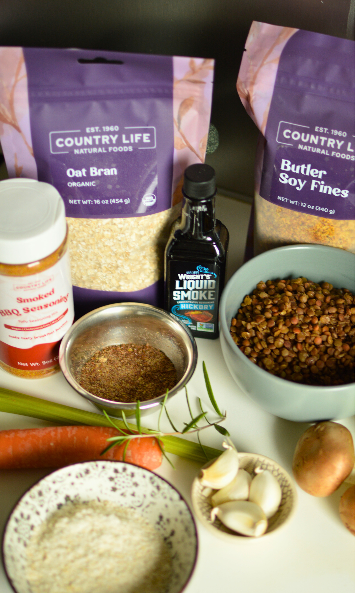 - In a food processor or with a hand blender, mix half of the cooked lentils and sautéed vegetable mix with the ground flaxseed, Butler soy fines, oat bran, and oat flour. Gently pulse until it is combined and some small chunks of carrot remain.