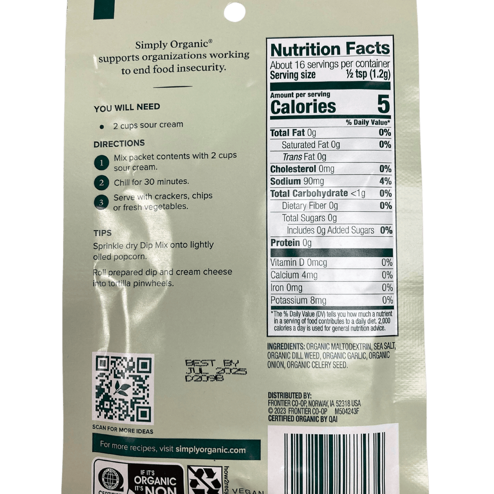 Simply Organic® Creamy Dill Dip Mix features the full, fresh flavor of organic dill, celery seed, garlic and onion. Simply mix with sour cream for instantly delicious dipping.